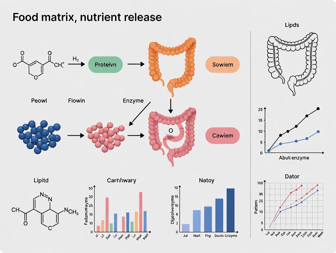This article provides a comprehensive analysis of the food matrix and its profound influence on nutrient release, bioavailability, and subsequent physiological effects. Tailored for researchers, scientists, and drug development professionals, it synthesizes foundational concepts, methodological approaches, optimization strategies, and validation techniques. The review explores how the physical and chemical structure of food governs digestion kinetics, modulates gut microbiota, and impacts the bioaccessibility of both nutrients and bioactive phytochemicals. By integrating insights from food science, pharmaceuticals, and clinical research, this work aims to bridge disciplinary knowledge and inspire the rational design of functional foods and nutraceutical delivery systems.