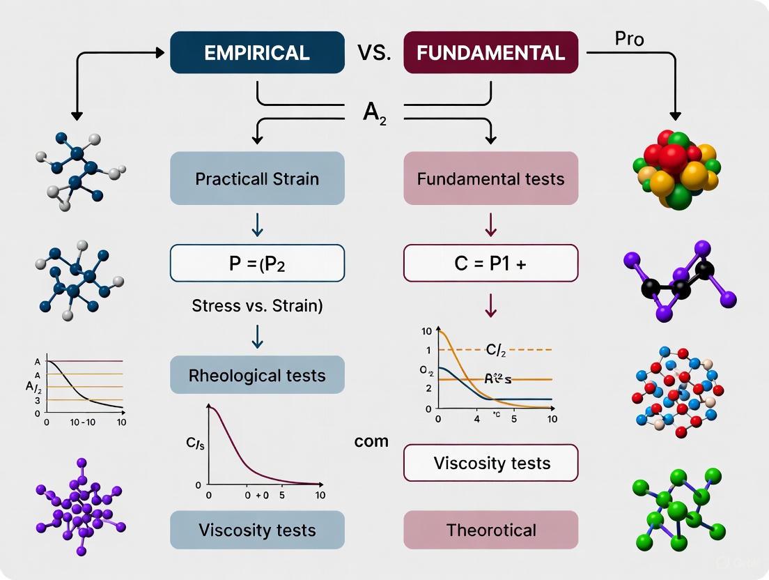 Rheology, the study of the deformation and flow of matter, is crucial for predicting material behavior in industrial processes ranging from drug development to food manufacturing [9]. Within this field, two complementary approaches are used: empirical rheology and fundamental rheology. Empirical rheological techniques simulate practical process conditions using equipment that replicates real-world deformations, such as mixing, extrusion, or spreading, providing data that has historically been correlated with end-product quality [10]. In contrast, fundamental rheology characterizes intrinsic material properties under well-defined, controlled deformation fields, yielding absolute scientific units like shear stress (Pa) and viscosity (Pa·s) [10] [9]. This guide objectively compares the performance of these two methodologies, underscoring their respective roles in research and development, particularly for pharmaceutical scientists and researchers framing their work within the broader thesis of empirical versus fundamental testing.