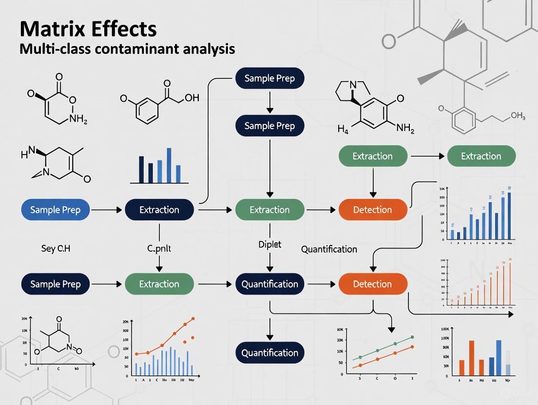 Matrix effects present a fundamental challenge in the accurate quantification of trace organic contaminants, particularly within the framework of multi-class analysis where diverse physicochemical properties must be accommodated within a single analytical method [55]. The evolution of liquid chromatography coupled to tandem mass spectrometry (LC-MS/MS) has enabled simultaneous monitoring of hundreds of analytes from different contaminant classes, including pesticides, veterinary drugs, pharmaceuticals, and personal care products [55] [10]. However, the increasing demand for comprehensive contaminant screening has revealed significant limitations when dealing with highly complex matrices such as compound feed and biological specimens.