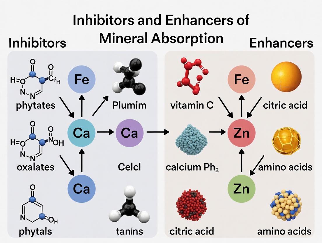 This comprehensive review synthesizes current scientific knowledge on the complex factors governing mineral bioavailability, with a specific focus on applications in pharmaceutical and therapeutic development. The article explores foundational absorption mechanisms, including paracellular and transcellular pathways, and details the dietary compounds and pharmaceutical agents that significantly inhibit or enhance mineral uptake. It critically evaluates advanced methodologies for assessing bioavailability, from in vitro digestion models to predictive algorithms and clinical balance studies. The content further examines cutting-edge optimization strategies, including engineered probiotics, permeation-enhancing technologies, and novel fortification approaches. Designed for researchers and drug development professionals, this review provides a robust framework for developing enhanced mineral delivery systems and addressing mineral deficiencies through targeted biomedical interventions.
