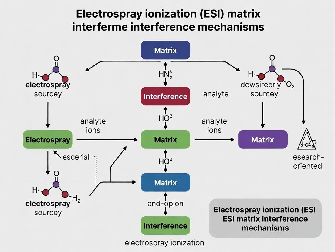 Matrix effects in ESI-MS arise through several physical and chemical mechanisms that disrupt the ionization process. During electrospray ionization, the LC effluent forms charged droplets that undergo solvent evaporation and repeated fission to produce gas-phase ions. Co-eluting matrix components can interfere with this process by competing for charge, altering droplet properties, or neutralizing analyte ions. The specific mechanisms vary by interferent type, but collectively they impact the final ion abundance measured by the mass spectrometer.
