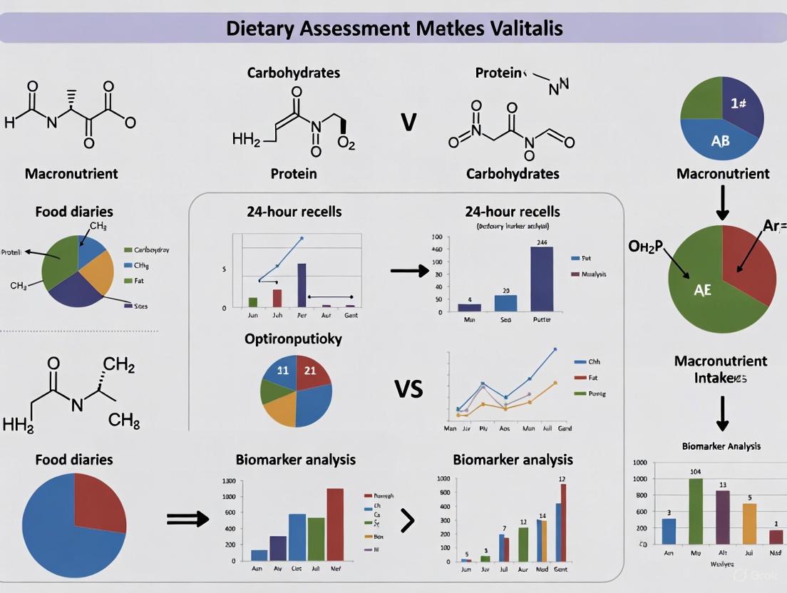 This article provides a systematic review of contemporary dietary assessment methodologies for validating macronutrient intake, tailored for researchers and drug development professionals.