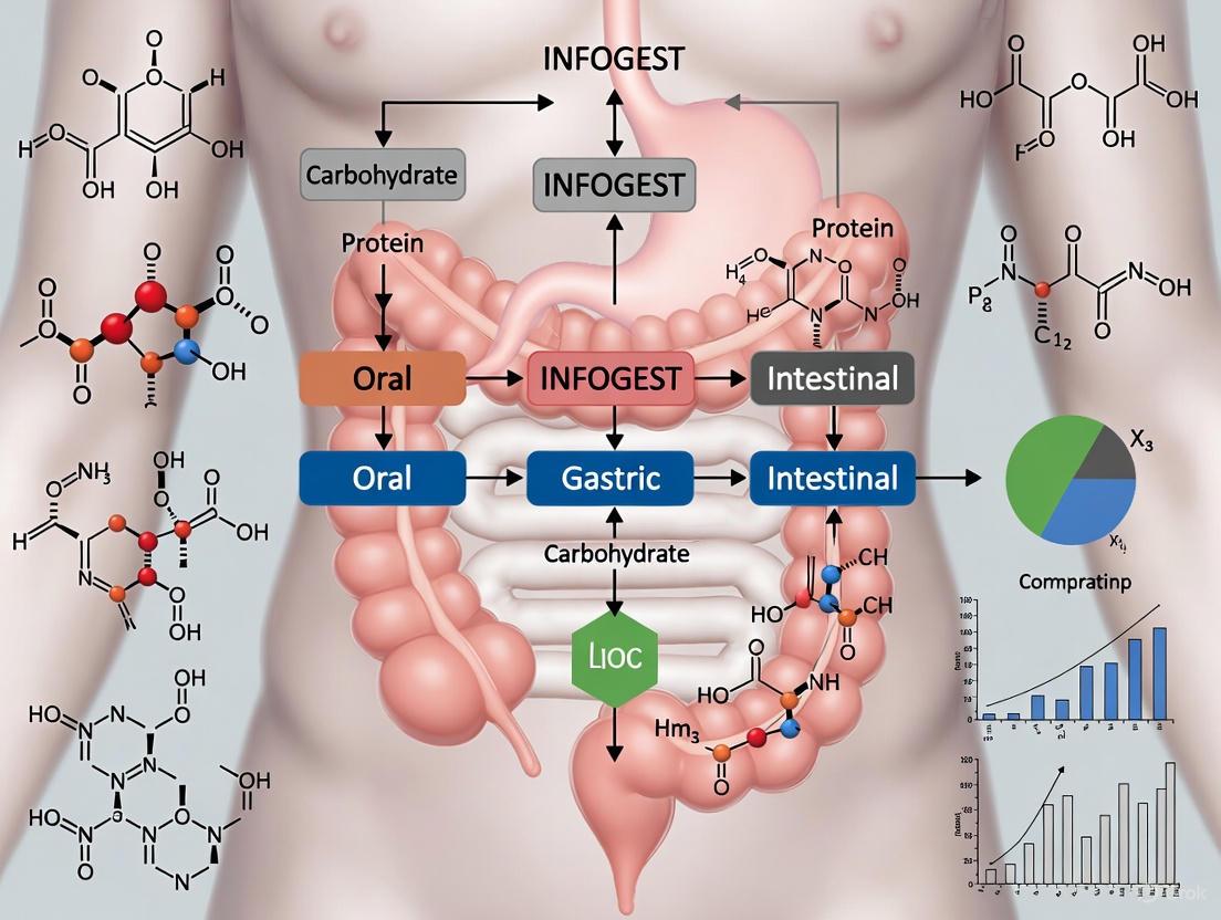 While the INFOGEST protocol primarily addresses digestion and bioaccessibility, advanced absorption models can be integrated to assess bioavailability. These include non-cell-based transport models, Caco-2 cell monolayers cultured on membrane inserts, organoids, ex vivo models, and sophisticated microfluidic "gut-on-a-chip" systems [66]. Each approach offers different advantages and limitations in simulating the complex intestinal epithelium, which consists of multiple cell types including enterocytes, goblet cells, stem cells, enteroendocrine cells, Tuft cells, M cells, and Paneth cells [66].